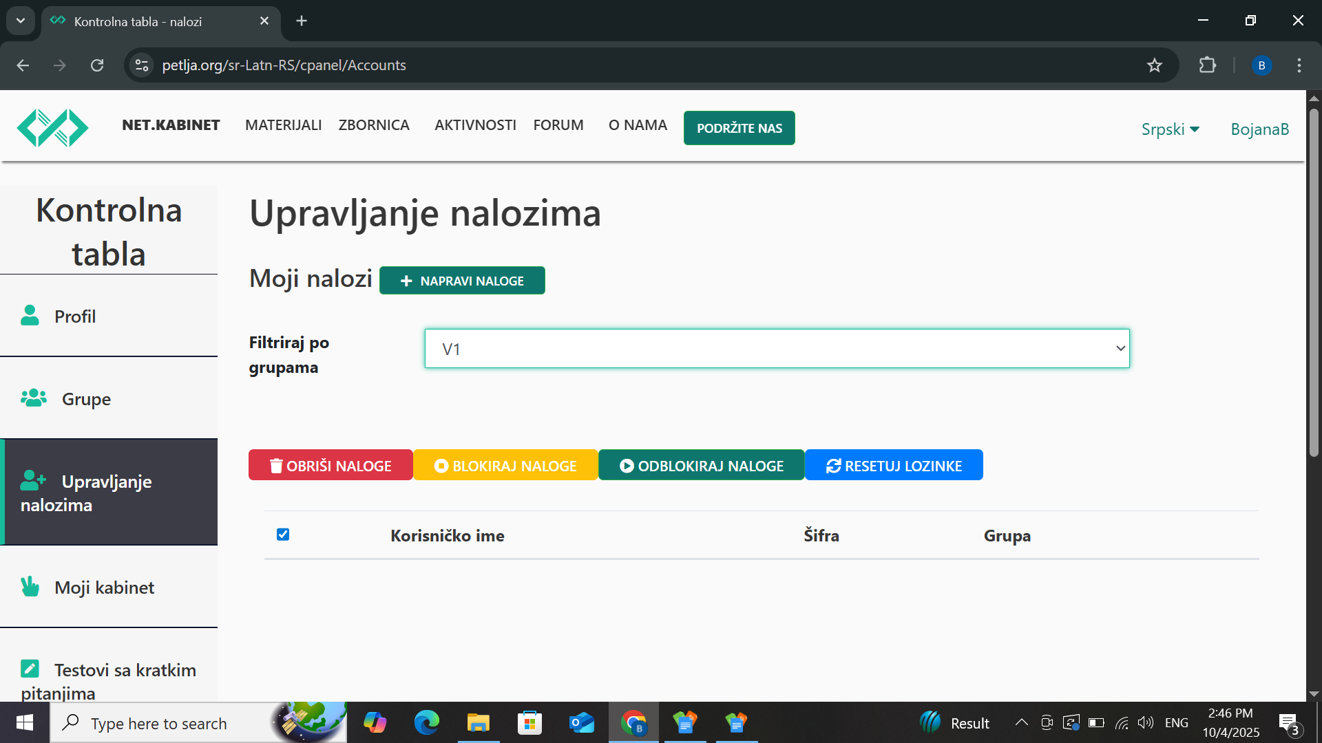 Da li ste naloge za učenike kreirali kao anonimne(upravljane naloge) ili kao dečije naloge?U kontrolnoj tabli klikom na dugme “Upravljanje nalozima” ili “Nalozi vaše dece”?